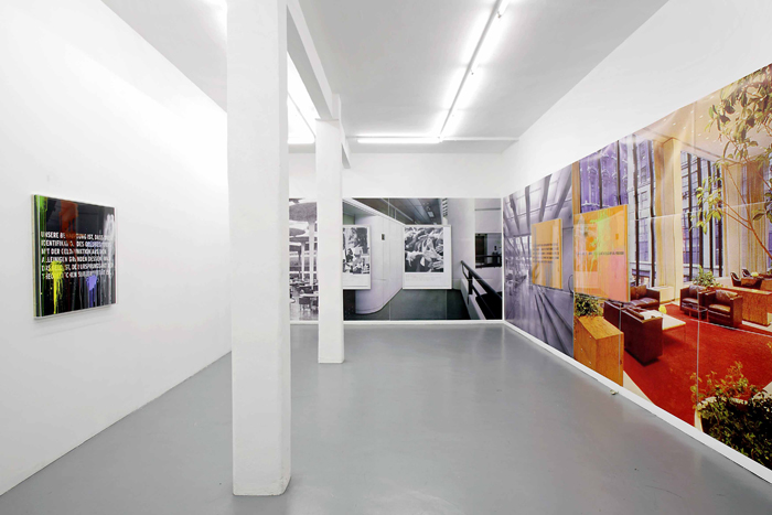 The exhibition displays two new series of text compositions on a wallpaper construct, depicting various - mainly anonymous - commercial interiors. Only the 1940ʻs Frank Lloyd Wright building for the Johnson Wax Company can actually be identified. One series is from „Gift. To Give. Giving. Given. Gift, if there is any“ (J. Derrida) and is put together from all sorts of available images from the media that visually illustrate the above citation, and also its innate contradictions. Contrasted with these formally pristine text fragments, the second series - also taken from a Derrida piece „Donner le temps“ - (give your time) - consists of the philosopherʻs sentences annotated by the artist as he reflects and thinks out loud. Giving, and Gift are of such nature that they interrupt the circulation dictated by economy (defined monetary value). A Gift „a thing given willingly to someone without payment“ in order to be a gift - cannot circulate - cannot enter the circuit of that which is passed along. A Gift cannot be transferred or exchanged - quite in contrast to all other goods of material value. On the other hand, in order for any thing, any item, to be object of an exchange, it has to have been a-priory obtained, acquired. In this zone between giving, the given and the acquired, the authentic gift implies no expectation of return of favours, no desire, no IOY bind, no obligation. A Gift is a one way street - as opposed to a product exchanging hands in an economic circuit. Other text works in the show reflect on thoughts by George Bataille, Karl Marx and Pierre Klossowski which tend to be formulated as mathematical, logical equations and to which the artist affixes personal traces of reflection.
