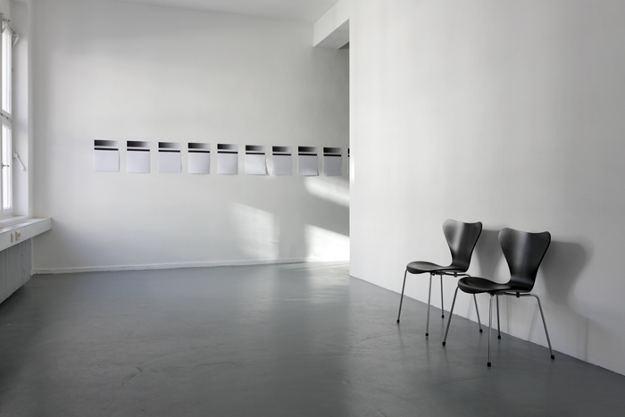 Lasse Schmidt Hansens whole show at the Galerie Reinhard Hauff is about inaccuracy in production of art (and other objects). The artist deliberately uses the minimal deviation from standards as the conceptual element connecting the pieces in the exhibition. „Untitled Grey“, for example, consists of a group of DIN A3 sheets of paper with prints of the grey scale done on different photocopying machines. Depending on the system preferences of the photocopier, the condition and make of the ink cartridge and the quality of the paper a different set of grey scale images result which the artist displays in a row according to the saturation of the grey hues produced by the machine. The composition „Photographing landscape. Some of it“ follows the same concept: A sequence of digital shots of a specific site in the vicinity of Rotterdam illustrates the impossibility of arriving at two identical views of the same spot. The invariably different contours of the horizon, the camera angle and the light nuances in the succession of shots on display make the viewer aware that contrary to the tradition of 17th century Dutch landscape painting, no single definitive recording of any given spot can be proclaimed today. The piece „3107/3107“ shows two certified copies of Arne Jacobsen’s popular design classic the Series 7 chair. This chair, designed in 1955, became one of the most popular late 20th and early 21st century chairs. Placing two of the mass-produced copies of a licensed reproduction of the „Original“ next to each other in the gallery show slight differences in size. It is impossible to account for the moment the difference/ deviation/ error or unfaithfulness to the „Original“ occurred in this ongoing process of working from an original standard. Perception, optical illusion, mind over matter, same, same but different: „By changing any design the whole perception of the world will change with it, even if it’s just with an inch“ (Lasse Schmidt Hansen).