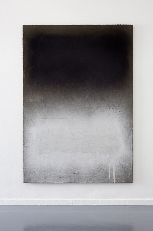 Marc Bijl: „Afterburner (Black over chrome)“, 2012, cement, spray paint, household paint on canvas, 200 x 140 cm.