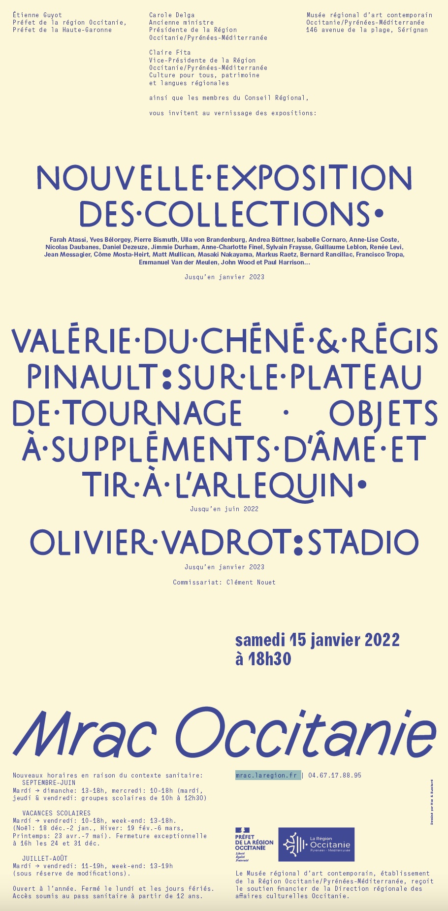 Grâce à l’introduction de ces nouvelles œuvres, le Mrac souhaite favoriser l’émergence d’un nouveau regard sur ses collections, allant au-delà du regard qu’engage une présentation traditionnelle, chronologique ou encore thématique. Des œuvres d’artistes d’époques différentes dialogueront entre elles (Jean Messagier et Andrea Buttner; Guillaume Leblon et Côme Mosta-Heirt, ou Daniel Dezeuze et Farah Atassi), d’autres ouvriront de nouvelles perspectives (Pierre Bismuth, Markus Raetz, Guillaume Leblon) et des interrogations (Ulla von Brandenburg, Renée Levi).