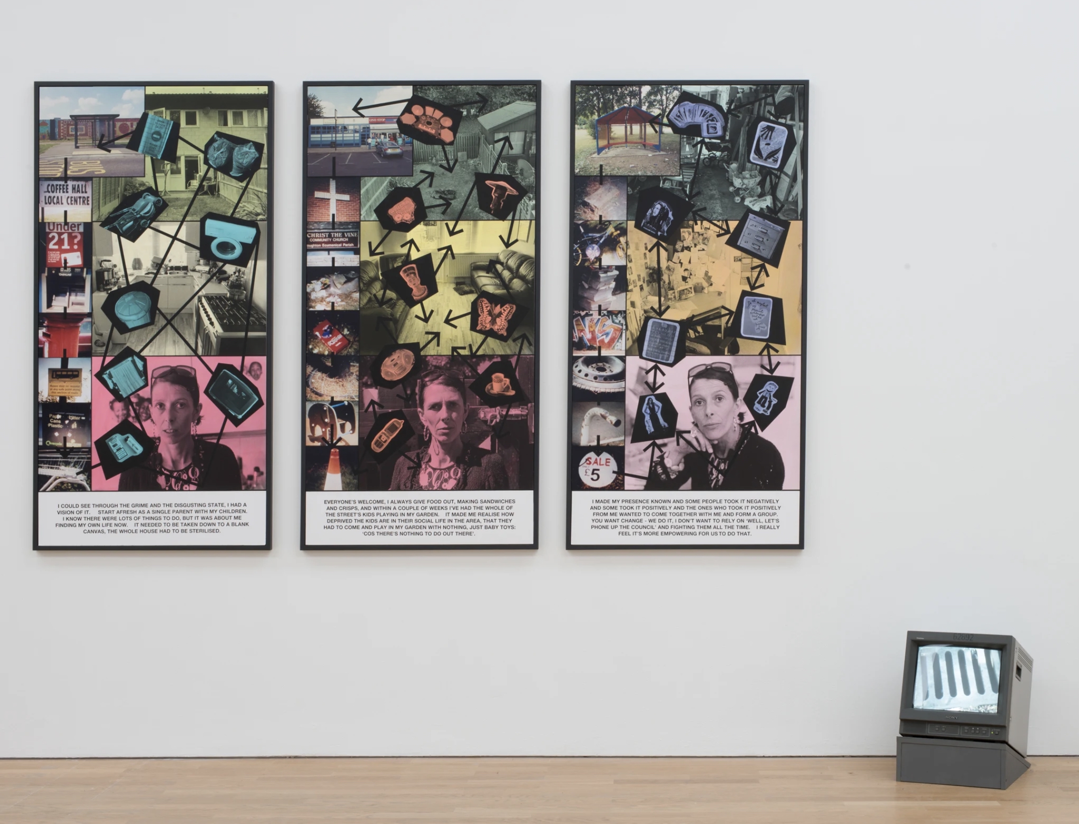Image: Stephen Willats: „Starting Afresh With A Blank Canvas, August 2007–March 2008“, 2007-08, photographic prints, photographic dye, acrylic paint, ink on card, and DVD film, three panels, each 155 x 78 cm, 61 1/8 x 30 3/4 in (SW 139), © Stephen Willats, Courtesy the artist and Victoria Miro.