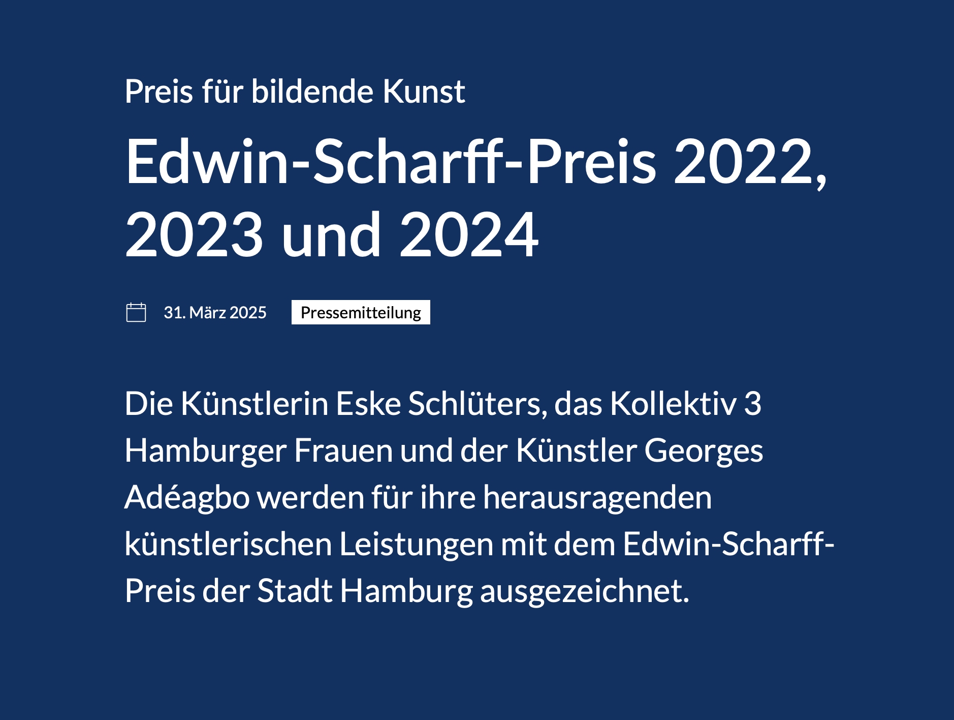 Dr. Carsten Brosda, Senator für Kultur und Medien: „Mit dem Edwin-Scharff-Preis würdigt die Stadt Hamburg Künstlerinnen und Künstler, die unsere Stadt kulturell bereichern und neue Impulse setzen. Mit Eske Schlüters, den 3 Hamburger Frauen und Georges Adéagbo zeichnen wir Kunstschaffende aus, die auf ganz unterschiedliche Weise gesellschaftliche Fragen aufgreifen, Denkräume öffnen und Debatten anstoßen. Ihre Werke verbinden Geschichte und Gegenwart, Individuelles und Gesellschaftliches, und laden dazu ein, die Welt aus neuen Perspektiven zu betrachten. Ich gratuliere den Preisträgerinnen und dem Preisträger herzlich und danke ihnen für ihren Beitrag zu einer vielfältigen Kultur in Hamburg.“